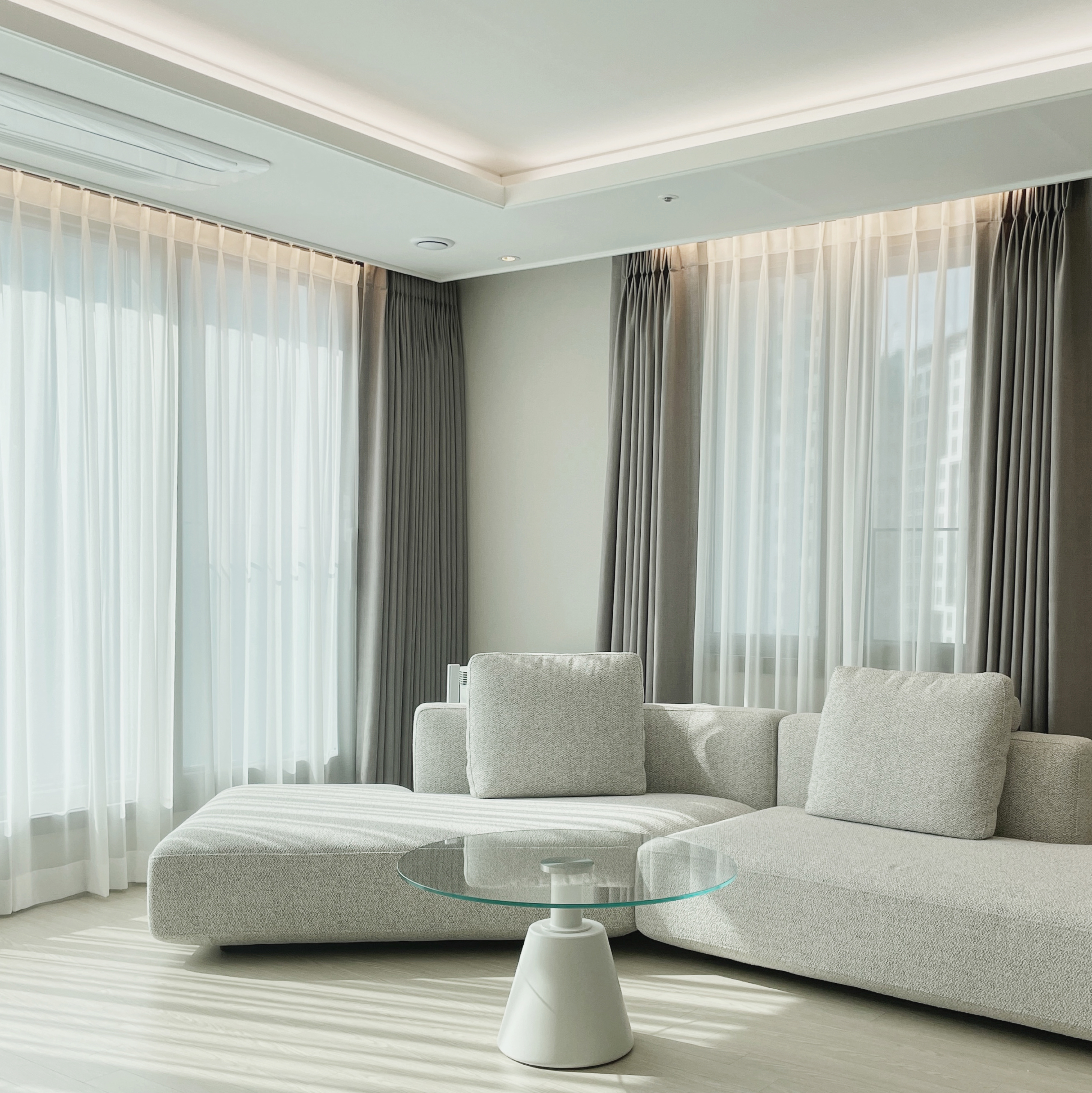 뉴트럴한 컬러와 부드러운 원단의 텍스처로 어떤 공간에도 잘 어울리는 베이직 포시즌 커튼입니다.