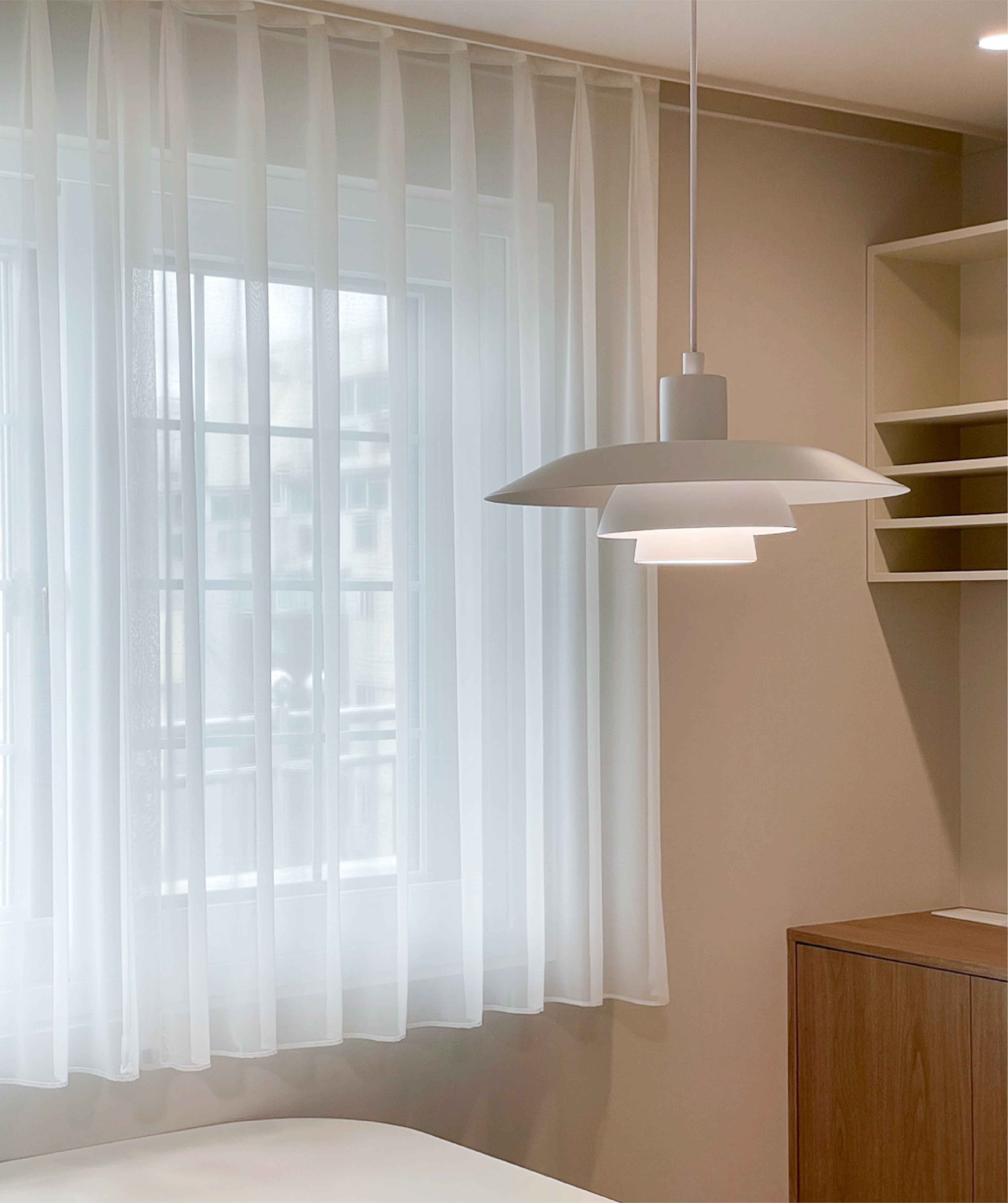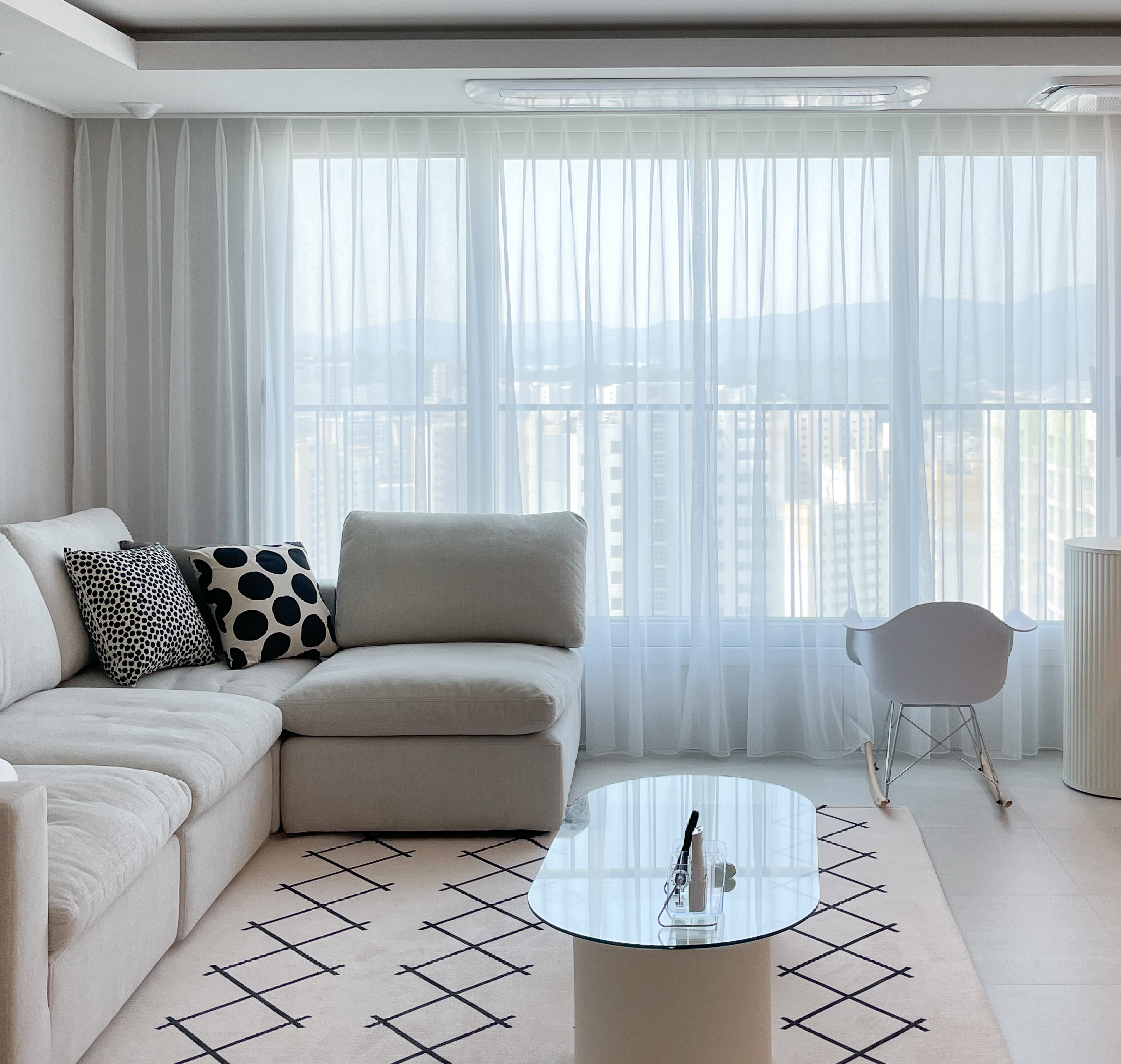 가볍고 쉬어한 텍스처가 공간을 더욱 부드럽고 화사하게 만들어주며, 모던하고 심플한 인테리어에 잘 어울립니다.