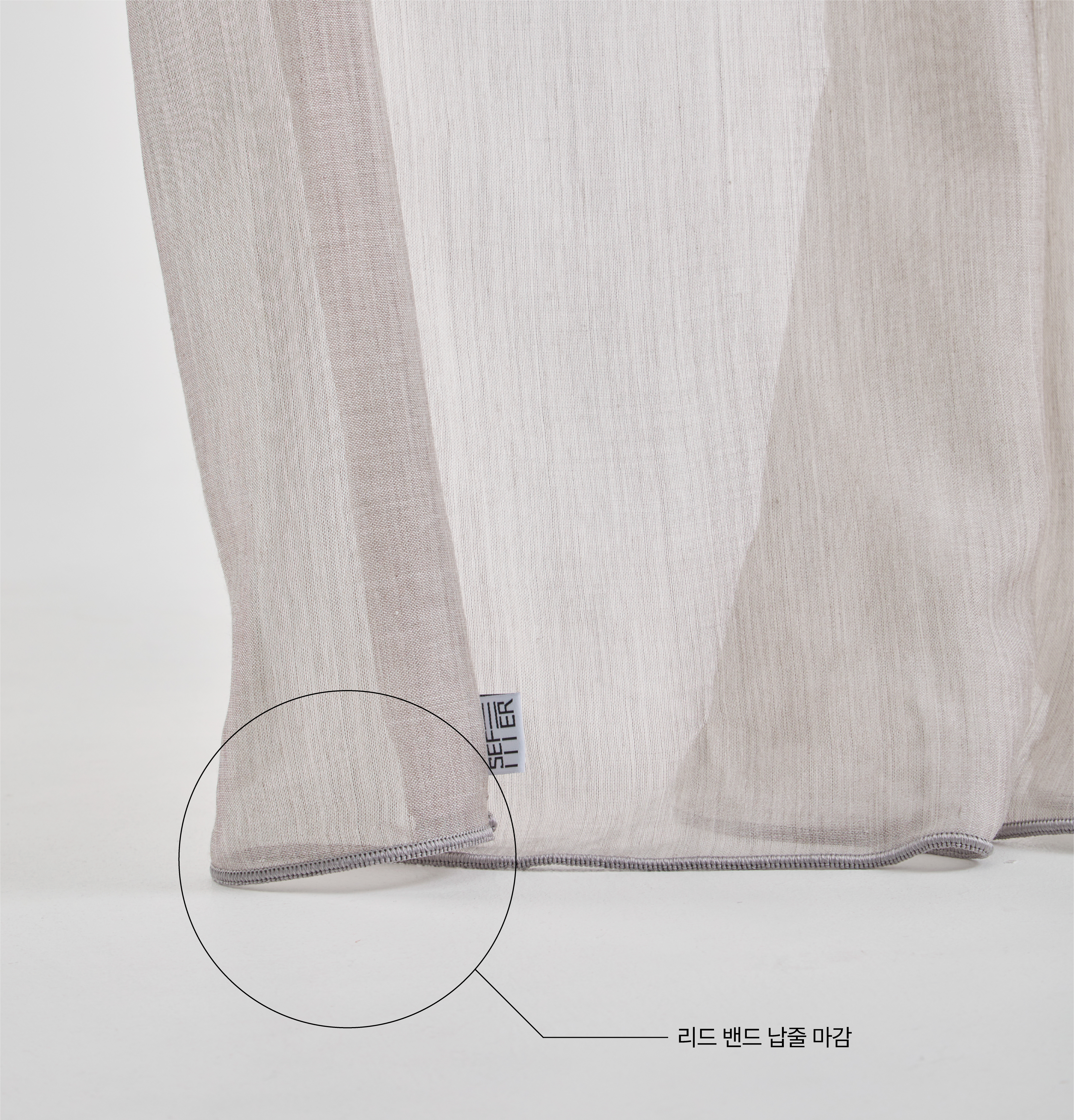 제품의 하단에는 일부 수입 원단에만 적용되는 리드 밴드(납줄) 마감이 되어 있습니다.